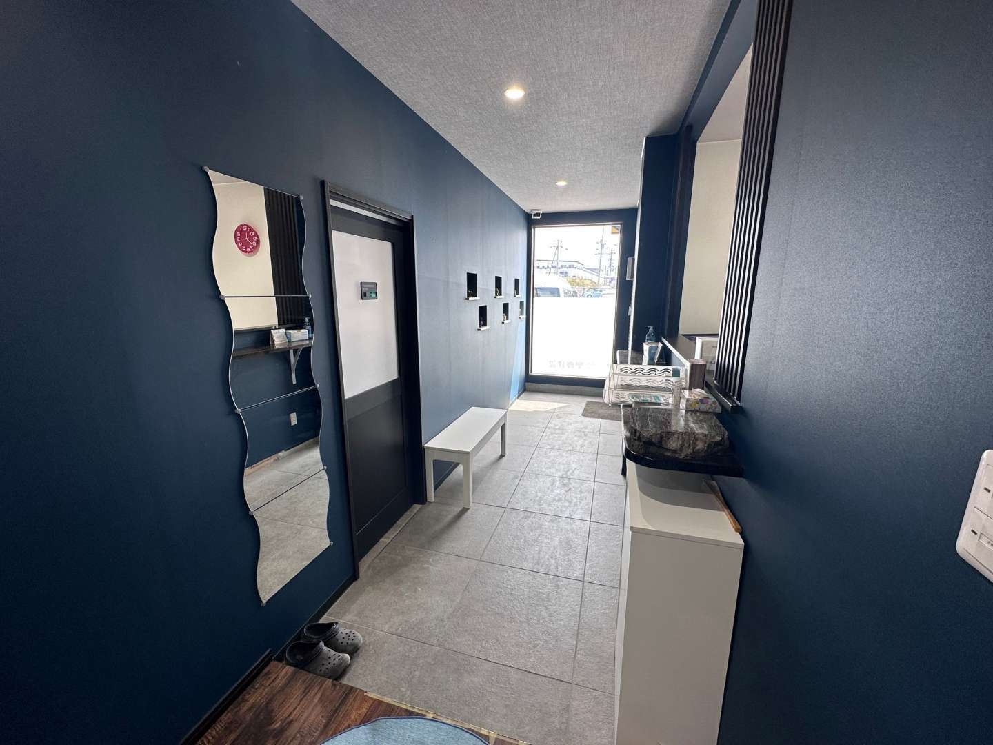 ↑この鏡からは、土足厳禁です。鏡の右側のお部屋は大会議室となっております。社内ミーティングや打合せ等こちらで行います。
